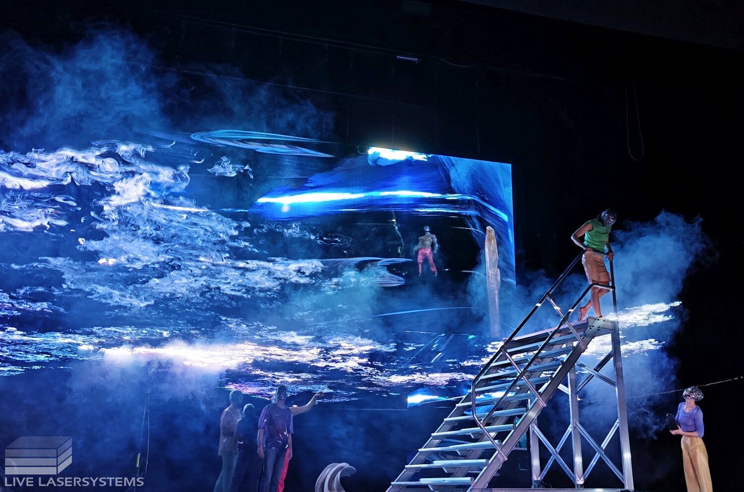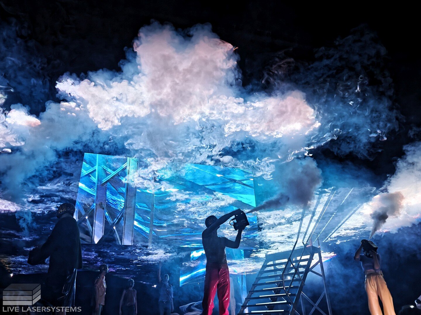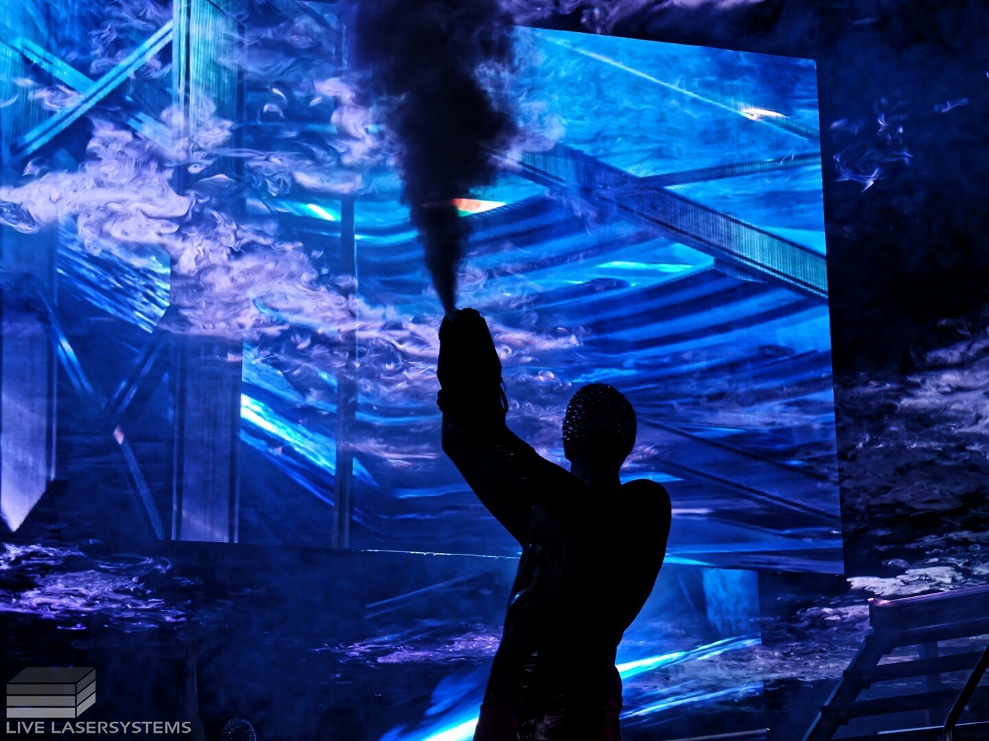 For his interpretation of "Die Angestellten", director Alexander Giesche had the idea of a liquid sky that spreads into the auditorium of the Volkstheater. The architecture of the parquet presented a major challenge here. Minimum heights could not be adhered to and so a solution had to be found that was safe but still clearly visible. In close collaboration with independent experts, we developed a custom version of our KORE series and were able to create an impressive experience that is safe for all spectators - even if they look directly into the laser beams.