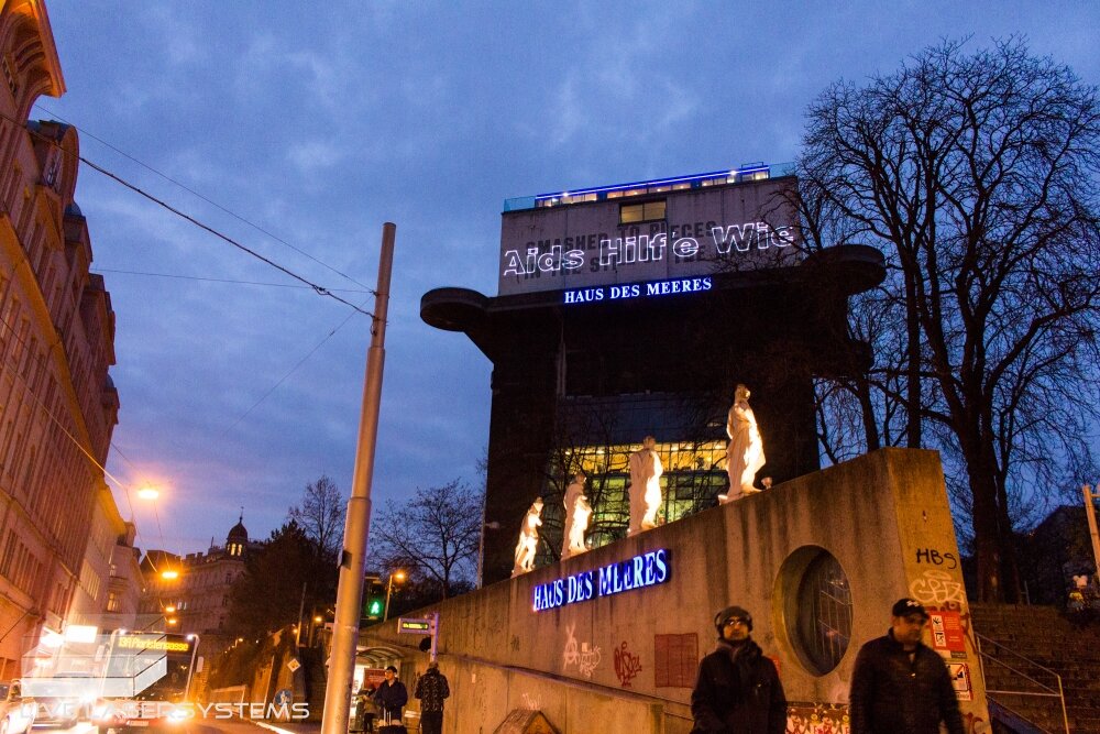 After a successful cooperation in 2015, LIVE Lasersystems was again responsible for a projection on occation of World-Aids-Day 2016. The days before as well as on the 1st of December LIVE Lasersystems projected a logo and a running text onto the facade of the Vienna Aqua Terra Zoo.